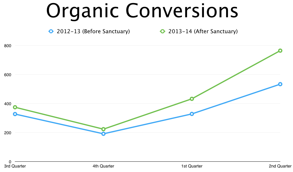 We began local search marketing for ForeverLawn in July of 2013. We set aggressive goals for the campaign – and exceeded them. After a year, ForeverLawn’s organic search traffic grew by 25.77 percent with 11,872 more visits from local searchers than the year before. Even more importantly, conversions from organic search visitors (ie. leads generated) increased 28 percent compared to the previous year.