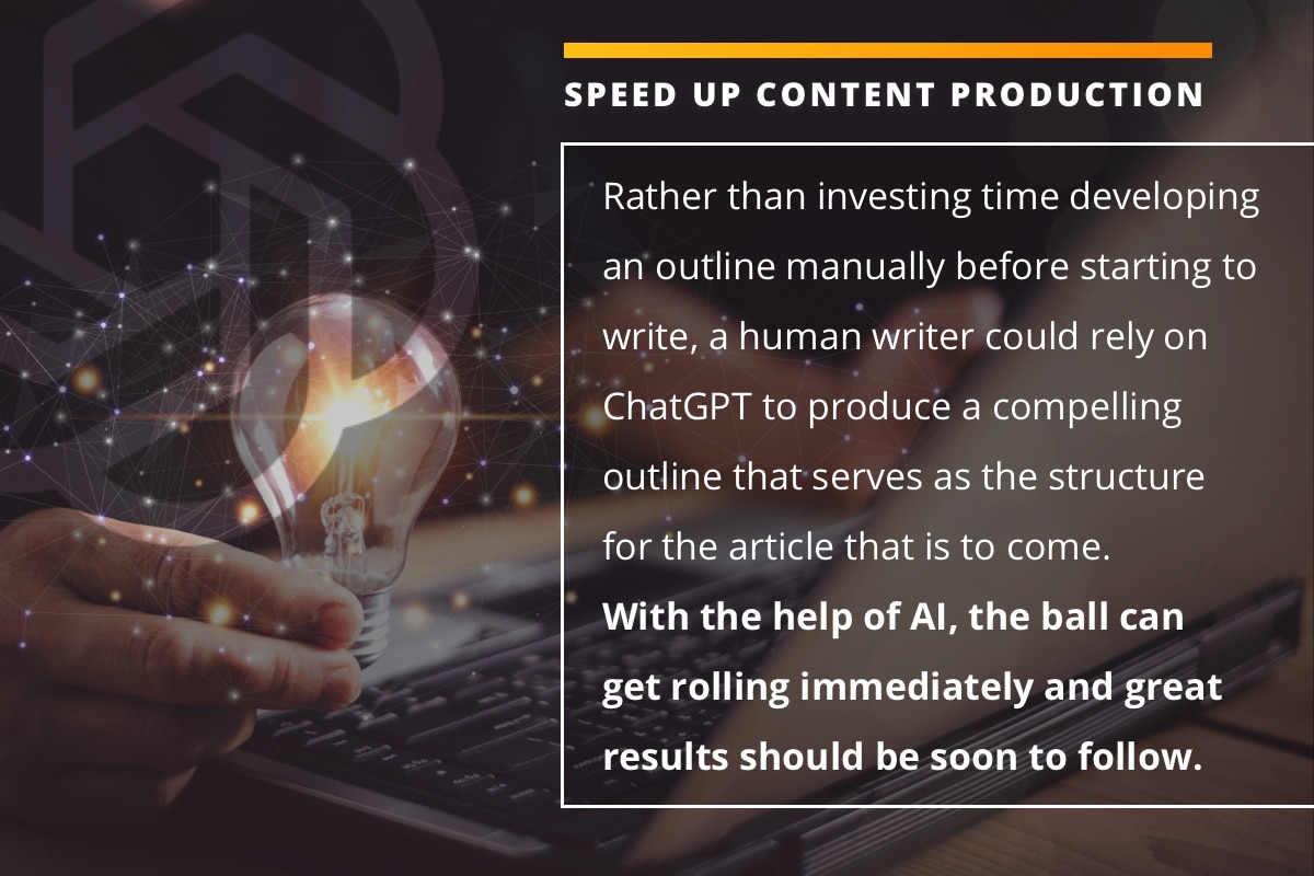 So, rather than investing time developing that outline manually before starting to write, a human writer could rely on ChatGPT to produce a compelling outline that serves as the structure for the article that is to come. This approach can help get the creative juices flowing and avoid that dreaded feeling that all writers know far too well – staring at the blinking cursor on the screen and not knowing what should come next. With the help of AI, the ball can get rolling immediately and great results should be soon to follow.