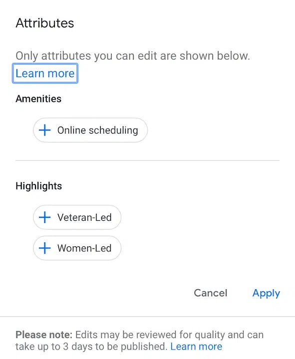 Certain factual attributes (e.g. outdoor seating, women-led) are directly editable by you. Subjective attributes (e.g. whether your business is popular with locals) rely on the opinions of Google users who’ve visited your business.