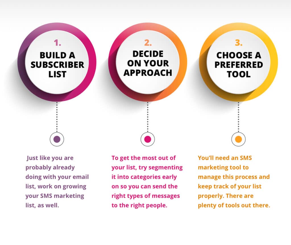 - Build your subscriber list. This is where it all starts. It won’t do any good to write messages and plan out your strategy if you don’t have anyone willing to receive the texts. Just like you are probably already doing with your email list, work on growing your SMS marketing list, as well.