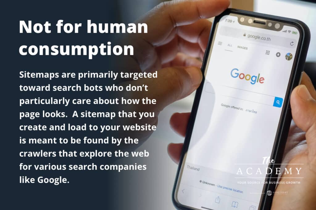 A sitemap that you create and load to your website is meant to be found by the crawlers that explore the web for various search companies like Google. A web crawler is tasked with finding various websites and then finding and indexing all of the pages on that site. While it can do this work by following internal links on the site from one page to the next, it is far more efficient when a sitemap is available. Using the sitemap file, the search crawler can go through the sitemap and immediately understand what is on the site and how it is organized.